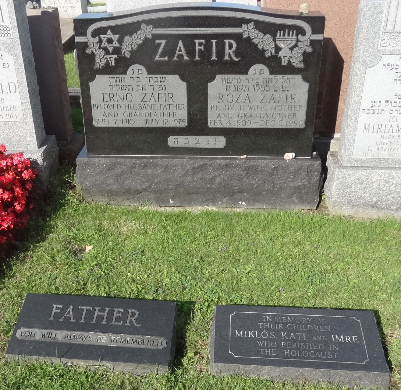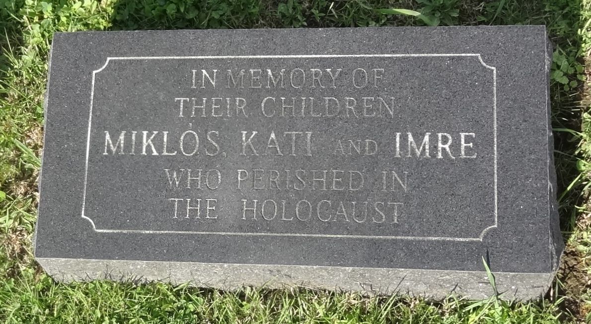 Comments/Notes Holocaust memorial footstone: In memory of their children Miklos, Kati and Imre who perished in the Holocaust.
