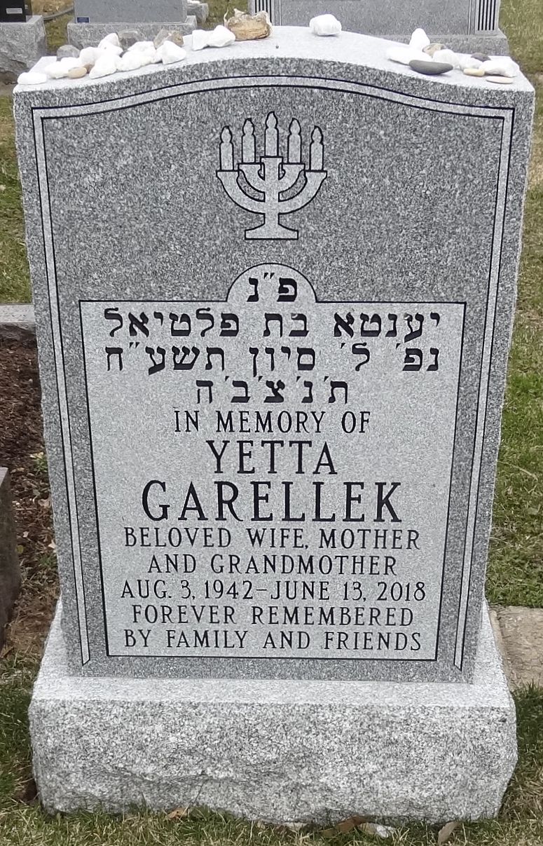 GARELLEK, Yetta (nee Stam) With courage and dignity, on Wednesday, June 13, 2018. Most beloved wife of Al for fifty years. Adoring mother and mother-in-law of Paul Garellek and Heidi Sternthal, Michael and Kim Garellek. Proud and loving Bubby of Jacob, Hailley, Zoe, Joshua, and Camryn. Dear sister of Miriam Pinchuk, and Laura Stam; and cherished sister-in-law of Jack and the late Rose Garellek, Faye and the late Irving Avrich, Frances and the late Sam Garellek, and the late Manny Garellek. Yetta will be deeply missed by her nieces, nephews, family and many friends. The family would like to acknowledge with sincere gratitude the love, friendship and care shown to Yetta by her nurses Sabrina, Theresa, and Mel. Special thanks to Merle for her many years of devotion to the entire family. Funeral service from Paperman & Sons, 3888 Jean Talon St. W., on Sunday, June 17 at 10:00 a.m. Burial at the Baron de Hirsch Cemetery, de la Savane. Shiva at her home, 5840 Marc-Chagall #407, C.S.L., from 2:00 to 4:00 and 7:00 to 9:00 p.m. Contributions in her memory may be made to the Cedars Cancer Institute, (514) 843-1606. |
