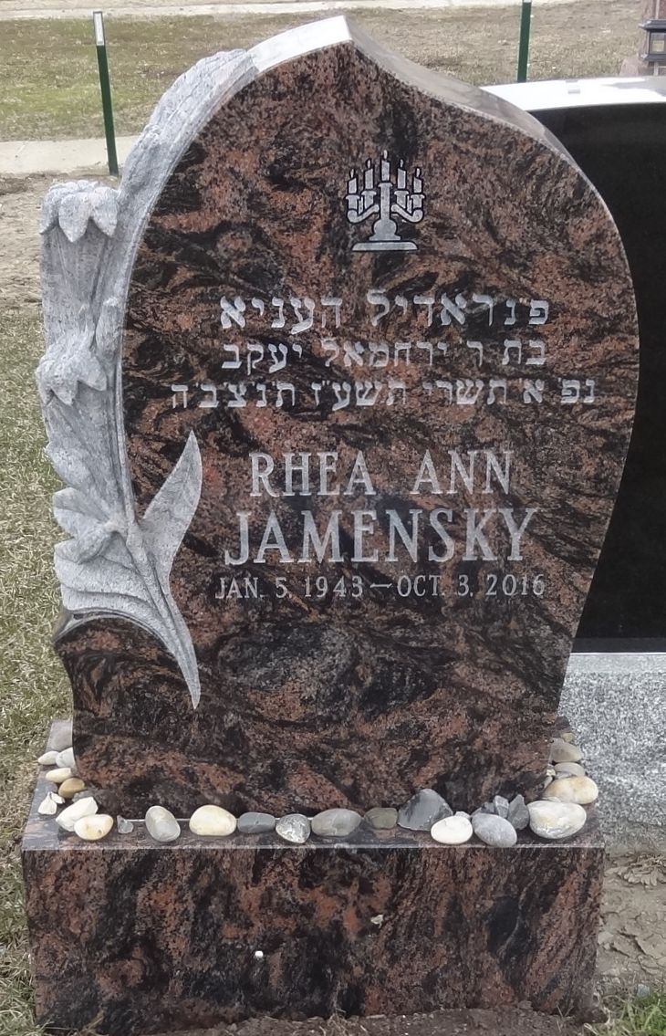 JAMENSKY, Rhea Ann (nee Weinberg) Suddenly on Monday, October 3, 2016. Beloved wife of Jerry Jamensky for fifty-two years. Devoted mother and mother-in-law of Lita and Dr. Joel Kravitz, Drs. Neil and Jordana (Rudnikoff) Jamensky, Glen Jamensky. Cherished Bubbie of Justin and Jonathan Kravitz; Tara and Trevor Jamensky. Dear sister of Edward Weinberg; sister-in-law of Irwin Jamensky. Funeral service from Paperman & Sons, 3888 Jean-Talon St. W., on Wednesday, October 5 at 12:00 noon. Burial at Baron de Hirsch Cemetery, de la Savane. Shiva at her home. Contributions in her memory may be made to the "Rhea Jamensky Memorial Fund", c/o the Jewish General Hospital Foundation, (514) 340-8251. Forever in our hearts |
