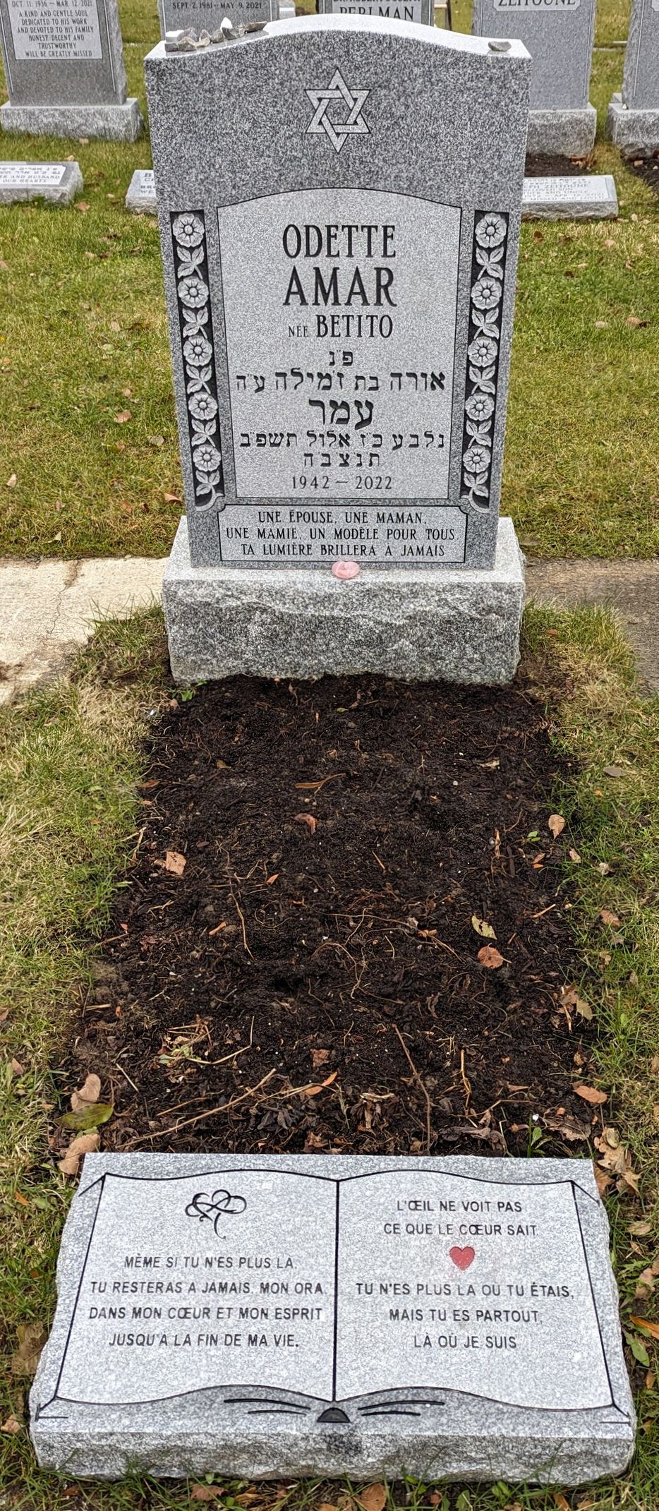 It is with enormous sadness that we announce the death of Odette Amar (née Betito) on Friday September 23, 2022 in the afternoon, after a courageous fight against devastating cancer. Daughter of the late Armand Betito and the late Jamila Betito (née Ohayon), she leaves to mourn her husband, David Amar and her children and her husbands, Philippe and Kim, Caroline and Frédérique, her brothers and sisters, Victor Betito, Georges Betito , Raphy Betito, Sylvia Zagury (née Betito) and Nicole Azoulay (née Betito), her grandchildren, Anthony, Alexandra, Aurélie, Adam, Alison, Alicia, Jonathan, Michael, Raphaël, Laurent, Joshua, Victoria and Émilie, as well as her sisters-in-law and brothers-in-law, Gilberte Amar, Patricia Amar, Denise Betito, Mercedes Betito, Dolly Betito, Esther Betito, Max Sebbag, Charlie Azoulay and Salomon Zagury. Odette will be greatly missed by her family, her friends and her nieces and nephews who always considered her the pillar of the Betito Family, the one who gave love to everyone and who made the world around her shine through his kindness and his bright smile. The family would like to thank Murielle Zagury and Nathalie Julien for their dedication. The funeral service will take place on Sunday, September 25 at 2:15 p.m. at: Paperman & fils, 3888, rue Jean-Talon O. The burial will take place at the Baron de Hirsch cemetery, located at 5015, rue de la Savane. |